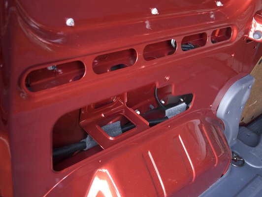 A raktérbe körülnézve két dolgon akadt meg a szemem. A szép emberes méretű rögzítőszemeken, és az oldalsó fal burkolatának teljes hiányán. A bal oldalon például egész gondolányi feltölteni való áru tűnhet el valahova a karosszériaelemek közé egy izmosabb kanyarban. Pedig a csavarok helye ott van, és a farostlemez nem lehet olyan drága. De legalább az aljára került csúszásgátló gumi. Ezt le is teszteltem, amikor is egy kb. 40 kilós szervert szállítottam és majdnem az út végéig kibírta elmozdulás nélkül. Természetesen az út végén egy fékezés után hangos döndüléssel jelezte, hogy nem sikerült teljesen helyesen rögzíteni. Amúgy a raktérbe 3,7 m3 valami fér be, kipróbálni persze nem tudtam, valahogy nem volt kedvem feltölteni egy kerti slaggal. Na meg mondjuk kicsit leült volna a hátulja, hiszen mindössze négyszeres lett volna a túlterhelés.