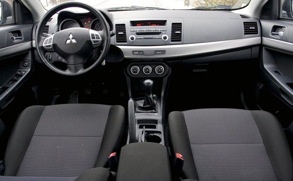 Ha eltekintünk attól, hogy végtelenül egyszerű, sőt, mondjuk ki, csúnya a Lancer utastere, meglepően jól fogjuk érezni magunkat. Míg szemünk csak a fekete műanyagokat látja, kényelmesen ülünk, kezünk minőségi anyagokat, precíz szerkezeteket tapint csak egyre. Minden annyira profi, hogy szépen lassan elfelejtjük, hogy ez a látvány valójában nekünk egyáltalán nem tetszik.