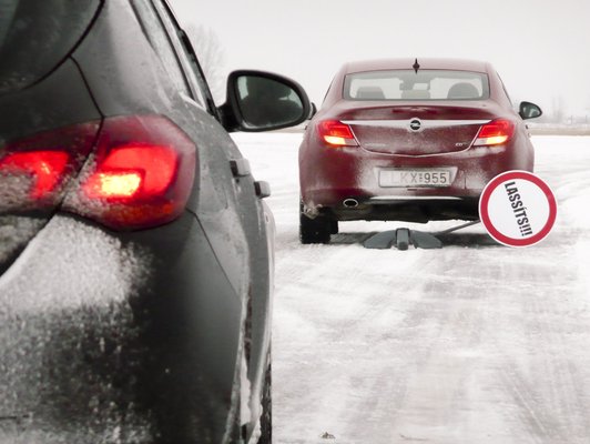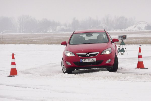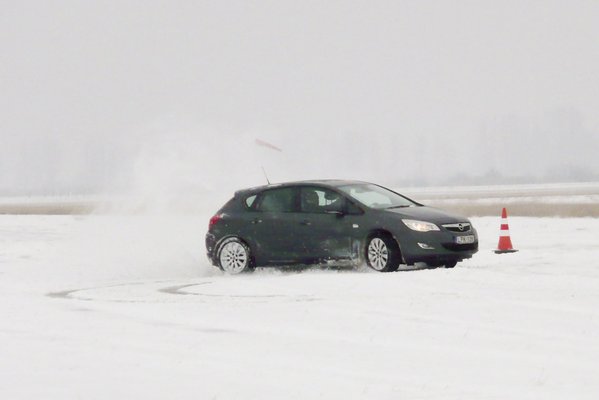 Most üljünk is az ortopédiai eldorádóba, és menjünk szlalomozni! Hóban csúszkálni, mármint felszabadult hülyegyerek módjára csapatni sajnos nem lehet, mert csak az egyik tesztautóban volt hagyományos, bovdenes-húzós kézifék, a többiben elektronikus. Az új Astra ezzel együtt is furcsán tapadt, még abban a lejárt hóban is, amiben kiszállva könnyen elcsúszik az ember. A piroson Pirelli Sottozero volt, a michelines többiek jobban csúsztak, de azokat is igen jól fogta a menetbiztonsági elektronika. Amit kikapcsoltam – gomb egyszer megnyom, aztán hat másodpercig nyomva tart –, de valószínűleg igen hamar újra bekapcsolódik. A mechanikus kézifékes autóval persze láthatóan jól mulattak a kollégák.
