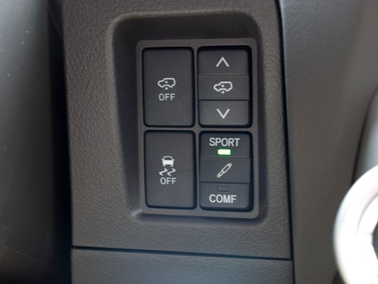 A futóművel és a hajtáslánccal kapcsolatos gombok a középkonzolra és a sofőr jobb térdéhez kerültek. A kocsi szintszabályzós légrugóval volt felszerelve, szépen el is nyelte a hepéket és hupákat. Terepen sokat segített a középső Torsen differenciálmű, viszont hátra ebbe nem jutott, az csak a VX Sportban van.
