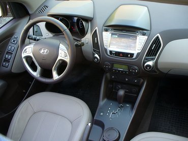Bár a többségnek kívülről tetszett az ix35, a belseje miatt viszont sokan fanyalogtak a külföldi kipróbálók közül. Hogy ismételten bizonyítsam a rossz ízlésemet, nekem éppen belül jön be inkább, kívül kevésbé. Ahhoz képest, hogy SUV, a kerékjárati ívek nagyon közel vannak a gumikhoz, amik kicsiknek tűnnek emiatt, a kocsi magas, de úgy próbálták látszatra alacsonnyá tenni, hogy az elején, meg különösen a hátulján a lehető legalacsonyabbra tették a grafikai elemeket. Így meg olyan, mint egy hátát púpozó macska, ami jól áll egy Jaguar XJ-nek, ami hosszú és lapos, de már nem annyira az ix35-nek, ami jóval rövidebb, viszont sokkal keskenyebb és magasabb. Nem rossz a design, de nem tudja, hogy szögletes akar-e lenni, kerekded, vagy ilyen fényekkel játszós, mint a Bangle-féle formák. Például a Ford Kuga, a VW Tiguan harmonikusabb, igaz, az arcát egyméteres magasságban hordó, szörnyű Renault Koleoshoz képest az ix35 egy Mona Lisa.