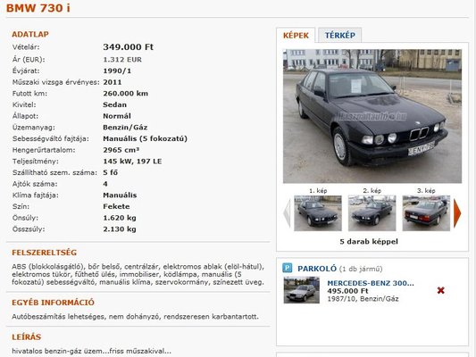 Egyikből sem lett semmi, én meg nem bánkódtam. Nem is keresgéltem tovább, de a sikertelen csütörtöki expedíció után még felugrottam a hahura, megmutatni a kollégáknak a meg nem vett autókat. A szűrőbe bekerült a max. 500 ezer forintos ár és a benzin-gázüzem, de puszta lustaságból a márka nem. Jött a lista, benne a W124-ek mellett ezzel: