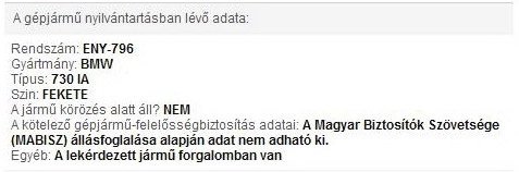Körözés alatt nem áll, ez jó. A forgalmit láttam, ott nincs nyoma forgalomból kivonásnak, tehát az autó távollétében történt. Reális oka kettő lehet: a KGFB és a gépjárműadó nem fizetése. Előbbi még jól is jöhet, saját nevemre szóló biztosítással visszahelyeztethetem az átírásnál, ráadásul (mivel forgalomban nem lévő autó) saját lábán, P-rendszámmal hazajöhet. Ha azonban az utóbbi az ok, azt először a régi tulajnak be kell fizetnie, addig én nem tudom visszahelyeztetni.