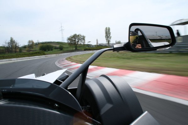 Sofőröm bedobja kettesbe, hiszen azért jött, hogy végre kitaposhassa a szemét. Rátolja a hármast, nekem meg csak az idióta jár a fejemben, aki sóher volt szekvenciális váltót fejleszteni ebbe az autóba. Fék, majd vissza egybe, ami már rég leforgott, mire annyit mondhatnék, mukk. Ha egy normális áttételezésű KTM RC8R-en forognának le ilyen ütemben a fokozatok, hat másodperc alatt lenne négyszázon.