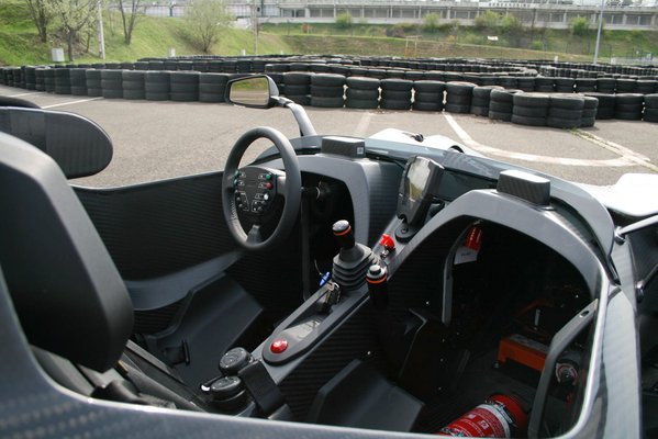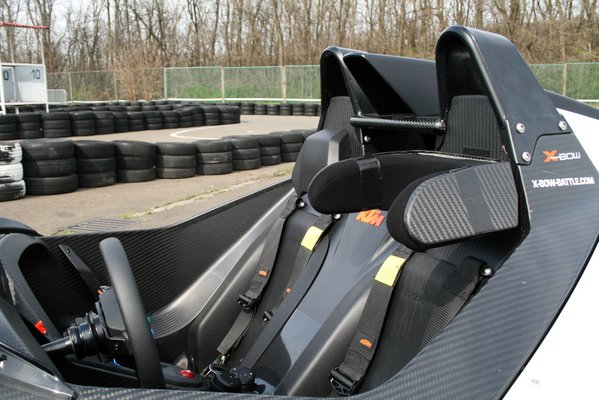 A X-Bow belseje teljesen autószerű, életszagú valami, sok karbonnal. Már amennyire életszerű, hogy egy szénkapszulában ülünk, ami most még egy helyben áll, de 3,9 másodperc múlva 100 km/h-val is mehet, ha hirtelen letapossuk a gázpedált. Mindannyian láttunk már képeken Atomot, meg mondjuk Radicalt. Na, azoknak olyan volt a belseje, hogy a tervező tüsszentett egyet, aztán a szétterülő váladékcseppek helyére balról-jobbra haladva berakta a kormányt, kapcsolókat, kis visszajelzőket. Ott is kézre esik minden, de a X-Bow egészen más. Itt minden forma letisztult, precíz, kitalált, profi. Azok versenyautók, azokhoz képest a KTM csak lagymatag játékszer, dizájnos kezelőfelülettel és gombokkal, amivel már nem a pénisz hosszabbítása, inkább csak keményítése a cél. Vicces, mert a X-Bow még így is hihetetlenül kemény gép.