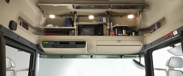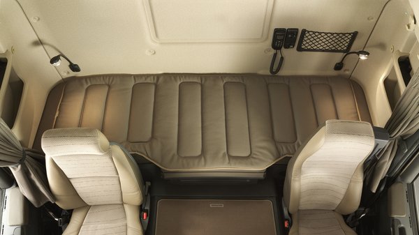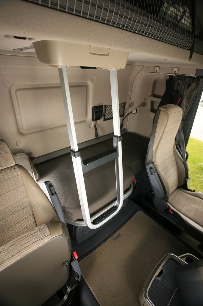 Ha már a fülkénél tartunk, említsük meg a Topline verzió (legmagasabb fülkeváltozat) előnyeit. Hatalmas belső tér, kiváló zajszigetelés, első osztályú anyagok és kidolgozás. A legjobban a rolóágy tetszett, amelynek párját ritkítóan gyors és egyszerű a szélesítése. Míg a legtöbb kamionfülkében kiegészítő ágybetétdarabok beillesztésével növelhető az alsó fekhelyek szélessége, addig az R-nél az ágybetétet a műszerfal felé húzva kerül elő a széles matrac addig a fekhely alatt megbúvó darabja. A pihenőhely kialakítását segíti a felhajtható ülőlapú utaskísérő ülés is, amely kényelmesen átjárhatóvá teszi a fülkét. Azt már szinte meg sem kell említeni, hogy még a motoralagúton állva sem veri a fejét a tetőbe az átlag testalkatú sofőr.