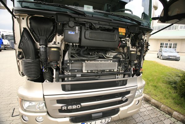 Másodszorra az tűnik fel, hogy a motor és a hajtáslánc gyakorlatilag zajtalanul végzi a dolgát; sík úton, nyolcvanas tempóban csak a gumik hangját és némi szélzajt hallani. A csendes futás egyértelmű Scania-erény volt az utóbbi években, de a 620-as még ehhez mérten is kimagaslóan teljesít. Annak ellenére is, hogy V8-as motorja elméletileg hátrányban van a kisebb teljesítményű, de rezgésmentesebben forgó, soros hathengeresekkel szemben. Hogy mégis miért ilyen halk? A magyarázat egyrészt a hatalmas teljesítménytartalékban, másrészt az automatizált váltó (Opticruise) új kapcsolási stratégiájában keresendő. E két tényező teszi lehetővé, hogy a fordulatszám gyakorlatilag alig megy ezer fölé, így a motor optimális üzemállapotban működik, zajokat és vibrációkat alig kelt. A csendes üzemen túl a fogyasztásnak is hasznára van a kis motorfordulatszám. Mielőtt azonban a fogyasztásról esne szó, tisztázni kell, hogy a kamionoknál nincs katalógusadat a fogyasztásra úgy, mint azt a személyautóknál megszokhattuk. Az elfogyasztott üzemanyag mennyisége ugyanis szorosan összefügg a szállított áru tömegével, a domborzati viszonyokkal, az időjárással, a sofőr stílusával és a hajtáslánc paramétereivel – hogy csak néhány tényezőt említsek.