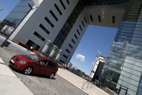Úti célunk a kölni Rajna-part, annak is a Rheinauhafen nevű szakasza. Száztíz évvel ezelőtt nyitották meg ott a város kikötőjét, amit mostanában élesztenek újjá, posztmodern felfogásban. Megy az építészeti ráncfelvarrás ezerrel (értem már, miért ezt a helyszínt választotta a VW) és egy kellemes negyed születik, folyóparti sétánnyal, bringaúttal, sétahajók kikötőivel, éttermekkel és bárokkal – és hogy a vendéglátóhelyeken stabil legyen a forgalom, irodaházakkal. Mind az én fotóim, mind a hivatalos gyári fényképek ott készültek, és azt kell mondjam, a Touran tényleg passzol ebbe a modern, ugyanakkor kellemes és mértéktartó környezetbe.