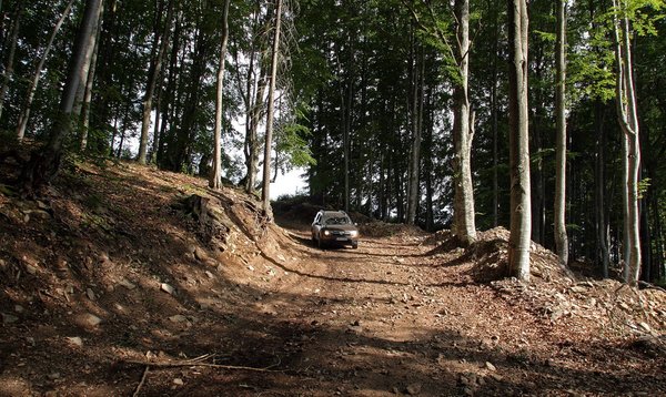A Gyilkos-tó felé fordítottuk a kocsi orrát, és miközben a kátyúkat kerülgetve azon töprengtünk, hogy vajon miért kenik le a betonfalú árkokat fáradt olajjal vagy kátránnyal a munkások, hirtelen egy kis fahídra és egy erdei útra lettünk figyelmesek. A meredek földút a bogdáni sípályára vitt föl, naná, hogy fölkaptattunk rajta, hiszen Bopat érdekelt a síbizniszben. Én már tudtam, mire képes terepen a Duster, és most a többiek is ízelítőt kaptak belőle: a hol köves, hol meg sáros, erdészeti munkagépek által összevágott úton a legkisebb erőlködés nélkül feltranszportált bennünket a hegytetőn álló tanyára. Nem értettük, hogyan jutnak fel télen ezeken a durva emelkedőkön a sízők a pálya tetejére, de a rejtélyre gyorsan fény derült: ratrakkal szállítják fel őket, amire egy korlátokkal körülvett platót szereltek.