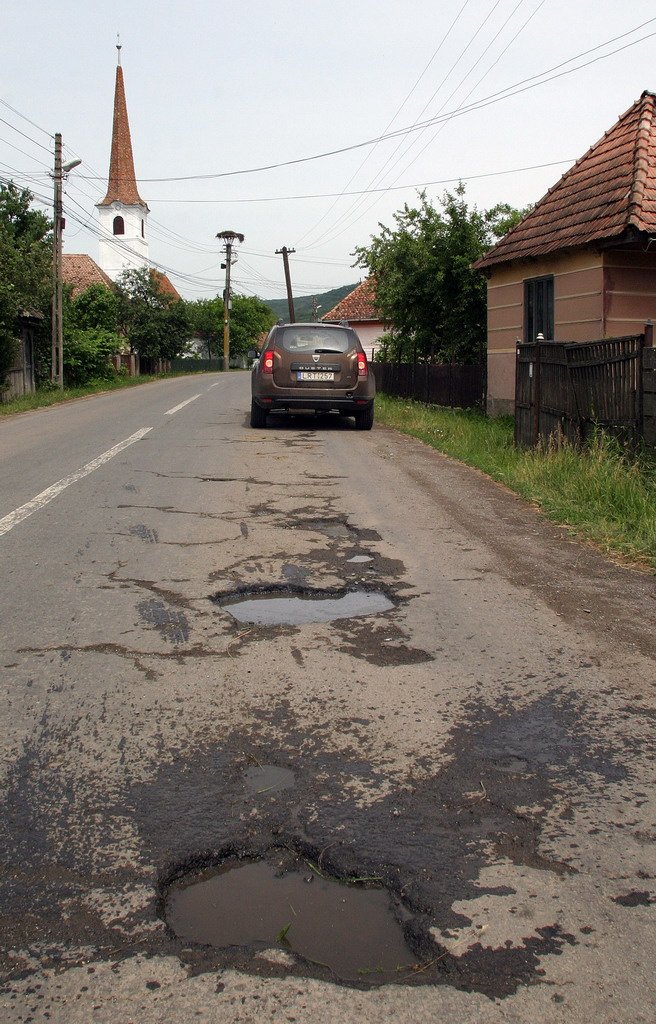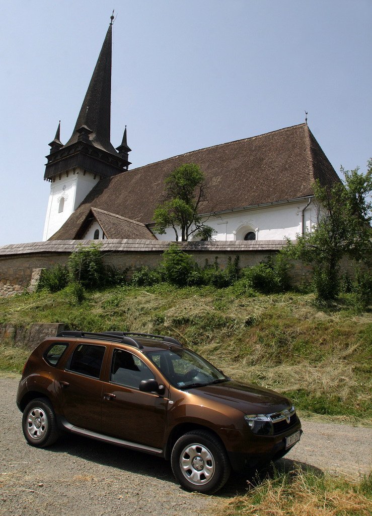 A határon Bopat vette át a vezetést. A Királyhágón átszökkenve betápoltunk egy adag miccset, megcsodáltunk egy óriásplakátot, amelyen 10 500 eurós áron hirdetik a Dustert, majd a körösfői erődtemplomig hajtottunk. Számomra ez jelenti a belépőt Erdélybe: mindig meghatottan járom körbe a falait, és ha csak tehetem, megcsodálom a gyönyörű, festett kazettás famennyezetét is. A határtól Kolozsvárig a nagy forgalmú, országos és európai főútvonalon mentünk, aminek a minősége egész jó, leszámítva néhány váratlanul felbukkanó kátyút. Jó iramban, a gyorsítósávokban dinamikusan előzgetve haladtunk, és a kanyargós szakaszokon kezdtük kapizsgálni, hogy a magas felépítés ellenére egészen jó a Duster úttartása, mérsékelten imbolyog, tartja az ívet, hirtelen kormánymozdulatokra is engedelmesen reagál.