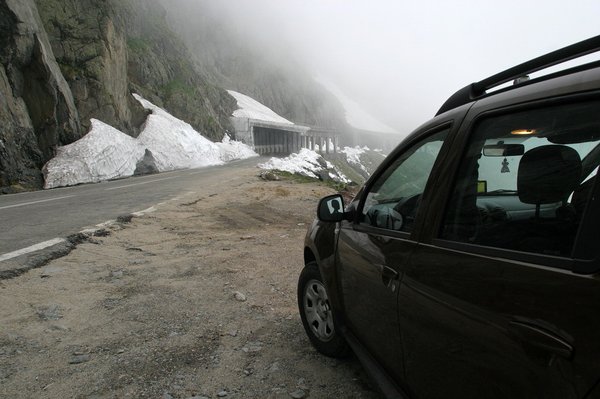 Egyetlen lendületből futottunk fel a hágó tetejére, percek alatt átkelve a magashegységi éghajlati öveken, a nyári kánikulából eljutva a dermesztő széllel támadó télbe. Az utolsó kilométereket magas hófalak között tettük meg, a 2040 méter magasan húzódó alagút túlsó kijáratánál pedig a jéghideg semmibe meredtünk bele: borzongató köd rejtette el a lenti tájat.