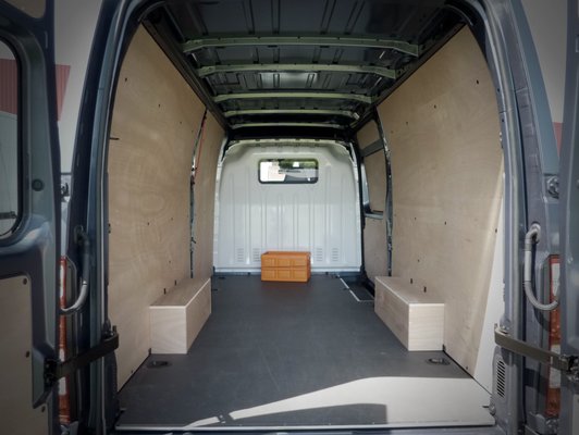 Közben volt időm gondosan körbenézni a rendelkezésre álló darabokat, a Németországból érkezett modellek példásan be voltak rendezve, a raktér a mi kocsinkban plafonig volt falazva farostlemezzel és még a lépcső is csúszásgátló aljzatot kapott. Ilyen lépcsővel és a hátsó fellépővel amúgy csak a hátsókerekes modelleken találkozhatunk, mivel ezeknek 13 cm-rel magasabban van a rakterük.