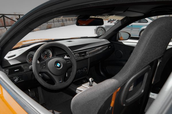 Mit kapunk a második M3 áráért? Kívülről csak az odass-narancssárga fényezés látszik, a fekete kiegészítőkkel és a szénszálszövet tetőlemezzel. Meg a bokacsonkoló első kötény-él, a karbon splitter, amitől végre nem kell levillogni a sztrádán a 305-nél lassabban menőket, hanem simán ketté lehet őket vágni széltében. És a beste állítható szárny. Lényegében ez is minden. A padló alatt nincsenek aerodinamikai huncutságok, nincs kamu diffúzor, egy fia elektromos kiállás a neonoknak, semmi.