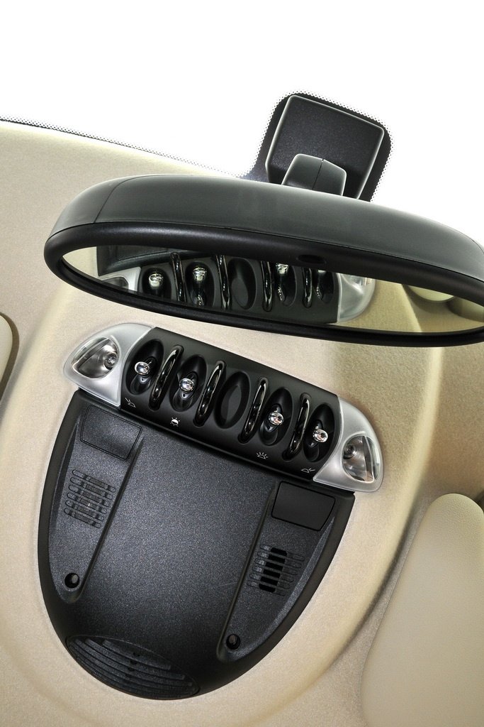 A belső tükörhöz és a jól kapcsolható, hatfokozatú váltó karja elé épített kapcsolósort a repülőgépekéhez hasonló karima védi; semmire sem jó, de vagány. Az ilyen ötletes apróságokban jók a cég tervezői – a kézifék is az utasszállítók gázkarját idézi. A kardánalagút tetejére sínrendszert szereltek, amin különböző kellékeket mozgathatunk: napszemüvegtartó, telefondokkoló, pohártartó vándorolhat a két üléssor között.