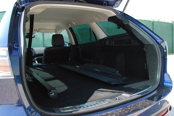 Ami már fontosabb, hogy a kombi szerintem jobban néz ki. Harmonikusabb a tető finom lejtése, a fenék sem csapódik drámaian a földbe, mégis határozott, ténylegesen felhasználható teret sejtet. Van is 1751 megtölthető liter, ami a Honda mindössze 1252-jéhez képest gigantikus, az Avensis 1609 literjét is üti, és ami döbbenetes: a csarnoknyi Mondeo kombi verzióját is (1745 liter). Az egykezes, nyaktilóként előrezuhanó karakuri-rendszer működik, ráadásul jól, megrántjuk a kart és zuhan a támla. Nem kell törődni a fejtámlával, nem kell dicséretképpen vállon veregetni, hogy teljesen simuljon, semmi. Kart meghúz, helyet kihasznál.
