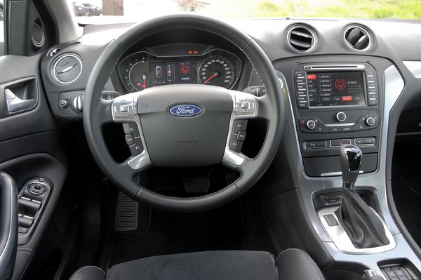 A rendelhető extrák listája iszonyatosan felduzzadt. Megértem, hogy műszaki szempontból nagy jelentőséget tulajdonítottak a külsőleg jelentéktelen modellfrissítésnek. Olyan fedélzeti rendszerek jelentek meg, amelyek beépítéséhez sokat kell melózni a háttérben: holttérfigyelő, automatikus távfény (ezt tessék megrendelni, nagyon jó dolog), radaros tempomat, állítható lengéscsillapítás, tolatókamera, egészen jól kezelhető navis rádió érintőképernyővel. Vagyis a Mondeo megkapta mindazt, amit mondjuk egy Insignia vagy egy Volvo S40 tud – ez utóbbi nyilván nem véletlen egybeesés, sőt, ugyanúgy is működnek a dolgok, mint a Volvóban. A jobb motorokhoz Powershift duplakuplungos váltó választható, ezt is láttuk már egy V50-esben, ez ugyanolyan elv szerint működik, mint a VW-féle DSG-váltók. A benzines turbómotort csak ilyennel adják, míg a 2,2-es dízel csak kézivel – más nem bírja el a nyomatékát.