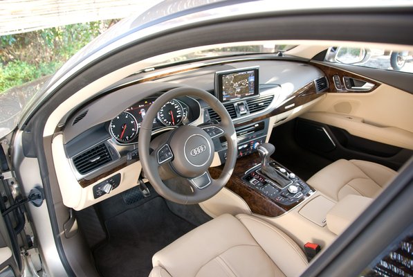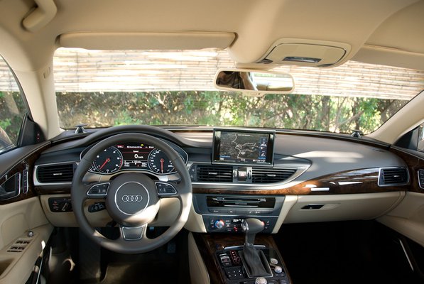Hibát keresni bármilyen Audi belsejében hosszadalmas feladat, az A7-esnél pedig egyszerűen kilátástalan. Olyan szintre jutottak el az ingolstadtiak, ami után már csak az alkohol és a fehér por jöhet, tovább fejlődni ebben a műfajban szinte lehetetlen. Büszkén mesélte a vacsoránál a beltér dizájnere, mennyi munkát fektettek a nyolc colos középső kijelző mozgató mechanikájára, illetve milyen szép, hogy a szellőzőrostély körül futó krómcsík betolt és kihajtott helyzetben sem szakad meg a TFT-nél. Ha ez volt a legnagyobb probléma a tervezésnél, sejteni lehet, hogy milyen színvonalra számíthatunk a vezetőülésből körülnézve. Minden a lehető legjobb helyen, katonás rendben. Szép laposra sikerült a műszerfal, és még fantáziát is felfedezhetünk a szélvédő alatti peremben, amely az ajtókárpiton folytatódik. A reklámszöveg amfiteátrum-érzésnek hívja, ami talán túlzás, de mindenképpen látszik rajta az igyekezet, hogy valami egyénivel fel szerették volna dobni a belteret.