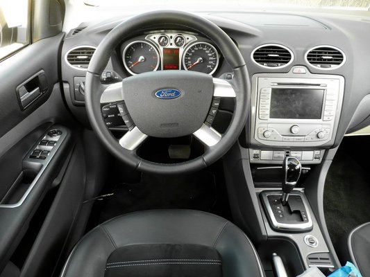 Ez tehát valójában egy Ford Focus Wagon, azaz kombi, Titanium felszereltséggel. Ennek megfelelően belül a műszerfalban matt ezüst lett a csőműszerek foglalata meg a szellőzőké, a Titanium felszereltséghez tartozó fűtött szélvédőt pedig végképp gyűlölöm. Eleve utálok mindenféle fűtött szélvédőt, főleg azért, mert amikor már rövidek a nappalok, és az ember egyre többet vezet sötétben, borzalmasan kápráztatja a szemet, ahogy a fémszálak közt megtörik a fény, és minden egyes féklámpából féltenyérnyi, izzó paca lesz az üvegen. Azt hiszem, a beépített navigációról mint rendelhető extráról ugyancsak nyugodt szívvel beszélhetek le mindenkit.