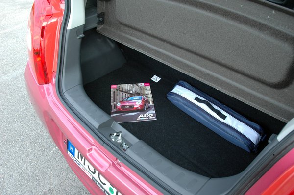 Ahogy hátrébb araszolunk, úgy nyújt még kevesebbet az Alto, bár ez az eredeti rendeltetését nézve nem meglepő. A csomagtartó a katalógusadat szerint 129 literes, ami a gyakorlatban egy nagyobbacska kenyértartónak felel meg. Persze egy harmadik autónak nem kell több, és a Suzuki egyébként sem erőlködött soha, hogy nagy helyet csináljon a csomagoknak – a Splashben 202, a Swiftben 211, az SX4-ben 270 literes a csomagtartó, ami a saját kategóriájukat nézve is viccesen kevés –, de arra ne gondoljon senki, hogy négy személy egy Altóban gigantikus tetődoboz vagy utánfutó nélkül elutazhat bárhova is, ha fejenként egy retikülnél többet vinnének magukkal.