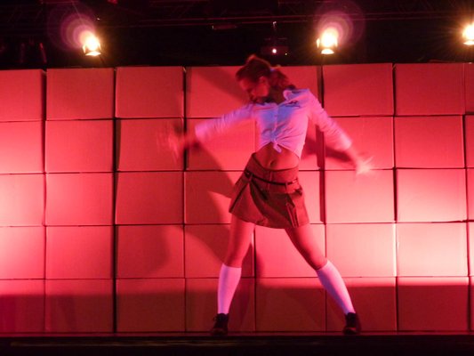 Aki túljutott az első akadályon, és kerülőút nélkül eljutott a célpontig, egyből beterelték egy üzemcsarnoknyi betonkockába. Bent teljes sötétség, döngve csukódott a vasajtó a hátam mögött, UV-fényben leültettek egy fehér terítős asztalhoz, és megszólaltak a hangszórók. Rövid idézetet hallottunk Örkény Tóték színdarabjából, majd az emelvényen egy jókora rakás kartondoboz körül izgalmas táncba kezdtek a lányok. Ekkor megnyugodtam. Dobálgassátok csak a dobozokat, úgy ni, te meg kapd el. A jól koreografált tánc végén persze előkerült a halom aljáról az ix20, de addigra el is felejtettem, hogy ez a Venga hyundaiul, csak azt sajnáltam, hogy már nincs mit pakolniuk a csajoknak.