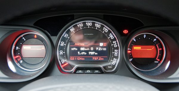 A műszeregység ötletes, világos és áttekinthető, a sebességmérő közepén színes a kijelző, oldalt pedig két másik, kisebb LCD-n tűnnek fel az információk. A citroënes, szeretnivaló kreténség – a fix kormányközép – itt is megvan, magán a kormányon – és a műszerfalbetéten is – igazán szép a szálcsiszolt alumínium. A kormányról amúgy az összes, menet közben használt funkciót elérhetjük, ráadásul fix közepének köszönhetően valószínűleg a légzsák formájával is játszani tudtak. Ezt szerencsére ezúttal sem teszteltük.