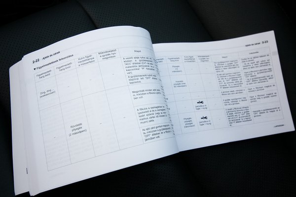 Azért viszont kifejezetten hálás vagyok, hogy az extra startgombos rendszert sem rakták bele a tesztautóba. Megnéztem a használati utasításban: háromoldalas táblázatban dekódolják a jármű különböző ütemű és hangú pittyegéseit, amelyek a felhasználói devianciákra (ajtónyitás és hasonlók) adott válaszok.