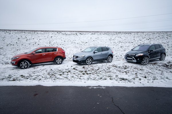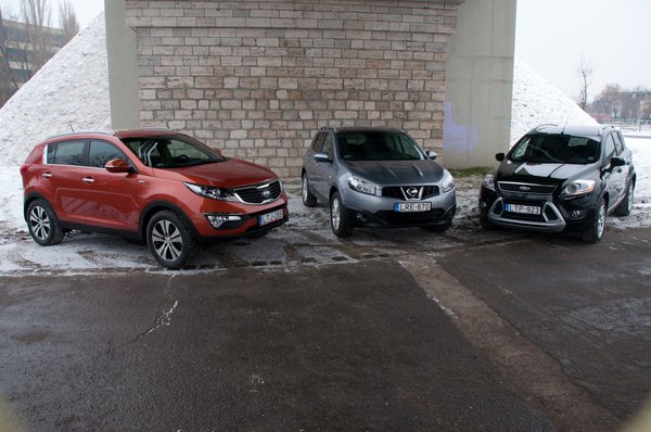 Szerepelhetne itt még GM Captiva/Antara páros, a VW Tiguan, a kategóriateremtő Toyo RAV-4, az ix35-ös Hyundai-tesó a Kia mellé, az LR Freelander, meg egy rakás egyéb is. De legyen elég most három reprezentáns, mert még elkopik a monitor. Vezetési élményért a Ford Kuga, általános magyarországi kedveltsége miatt a Nissan Qashqai, újszerűsége okán a Kia Sportage. Ha valaki nem látta még őket élőben, és csak a papírra vetett adataikat tanulmányozza, simán hiheti őket azonos autóknak, annyira hasonlóak a méreteik, a tömegük, a műszaki megoldásaik. Csak motorerőben van nagy szórás: a Kuga gyilkos 163 lóerővel száll ringbe, a Nissan egy tisztességes, 150-es számot tud felmutatni, a Kia viszont épp csak be mer sunnyogni a kötél alatt a szorítóba a maga 136-jával.