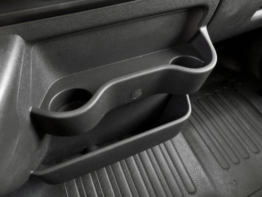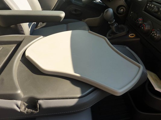 A legpraktikusabbnak azonban a kis asztalkává hajtható középső üléstámla bizonyult. Pohártartóval, fordítható laptop-alapzattal és persze egy apróságoknak való mélyedéssel. A külön könyöklős kapitányi ülés - a kárpitot leszámítva - kényelmes, a kis asztalka pedig a kezünk ügyébe esik. A kétemeletes ajtózsebek apósom 50 literes demizsonját is elnyelték volna, a kétliteres pillepalack nem okozott gondot nekik. Külön jó pont, hogy a tachográf is kapott egy gyárilag kialakított helyet és 12 Voltos csatlakozó akad a szélvédő tövében is.