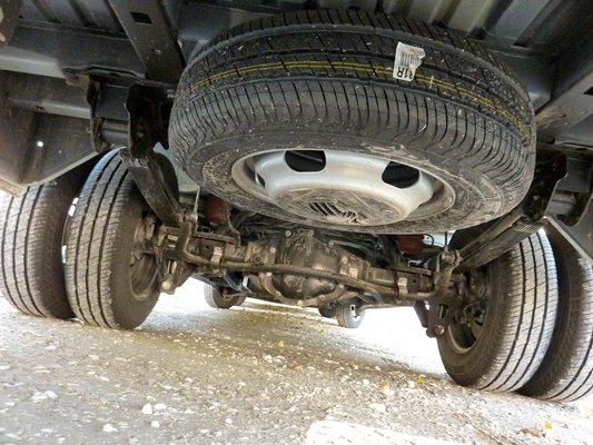 Legnagyobb hátránya az első kerekeseknél magasabb rakodóperem és csaknem két méterrel hosszabb féktáv. Bár a raktér 180 fokban is nyíló hátsó ajtajánál kialakítottak egy lépcsőt, az 548 milliméter ellenében így is soknak tűnik az a 674, ami a hátsókerekesek sajátja. Az ajtók felárért 270 fokban is nyílnak. Főleg, ha több mint négyméteres vörösfenyő gerendákat és temérdek más faanyagot kell bepakolni a raktérbe. Ráadásul a vörösfenyő sűrű, nehéz fa, így könnyen összejött legalább egy tonna, de a gigantikus doboz (14,9 köbméternyi) zokszó nélkül benyelte mindet. Kétségtelen, hogy a feláras, pozdorjafa-raktérburkolat kapott rendesen, de funkcióját betöltötte, a lemez nem sérült. A mindenfelé szétszórt gyűrűk és kampók segítségével pedig gond nélkül rögzítettük a masszív ablakokat is.