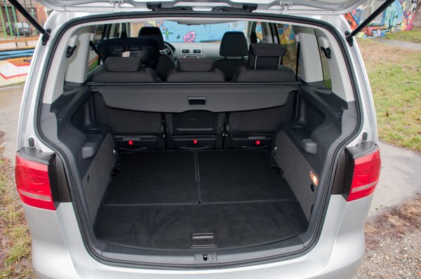 695–1989 – nem telefonszám, és nem is egy uralkodóház nyitó és záró évszámai ezek. Kitalálták, csomagtartó-űrtartalom, literekben. Brutális számok, leszűrhetjük, hogy akad ma ferdehátú, amelyikbe kétülésesre átalakítva sem fér annyi cucc, mint a Touranba öt üléssel. A hétüléses üzemmódra vonatkozó számot viszont még a Tévedhetetlen és Mindentudó Svájci Autókatalógus sem írta meg. Lehet, hogy azért nem, mert tizedeseket nem fogad el az adatbeviteli számítógépük, és a szám egynél kisebb? Azért az nem valószínű. Az araszom bőven elfér a csomagtér alsó részénél, tehát olyan 120–150 literesre tippelem a helyet. Hétvégén egy nagy, ruhákkal teli, puha táska elfért ide, mellé pedig egy kisebb szatyor, tehát valamire jó azért ilyenkor is.