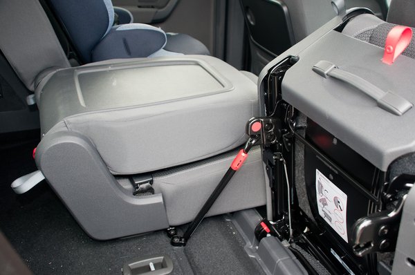 Egyébként a Touran belsejének átalakítási erő- és műszakiérzék-szükséglete nem haladja meg az átlagos fodrásznői szintet. Szürke szövetfül csukja le a támlát, piros szövetfül billenti előre az egészet, a padló közelében, a rögzítésnél ott a messziről ordító, két piros fül, amelyek átkattintása után, a beépített bőröndfogantyúk segítségével, némi (egyáltalán nem halálos) erőlködés árán máris ki is lehet emelni a széket. Leírni nehezebb, mint csinálni.