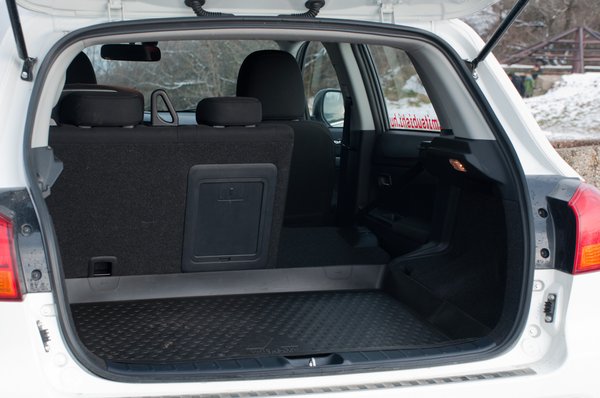413 liter eleve nem a világ, ráadásul a raktér padlója magasan van, a cuccokat fel kell emelnünk pakoláskor. Ráadásul a ferdehátúnyi raktér sem egyben jár nekünk, van egy nagyobb rész, valamint a padló alatt két kisebb üreg. Különös variációs lehetőségeket sem kínál: bővítésre kapunk egy sílyukat a hátsó üléssor kartámasza mögött, valamint a szokásos, osztottan dönthető hátsó támlákat, ennyi.