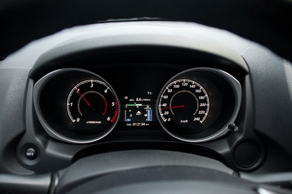 A középkonzol is szinte sivár a maga sallangmentességével, ráadásul a kijelző szedett-vedett, hiszen az óra kunkor nélküli farkincájú 9-essel és 6-ossal jelzi a számokat, a rádió viszont hajlítottakkal és más szegmensekből állókkal. De ha valaki a középső rész LCD-igénytelensége után vágyik valami jóra, vesse tekintetét a két műszer közötti panelre. Zseniális itt a fogyasztásmérő.