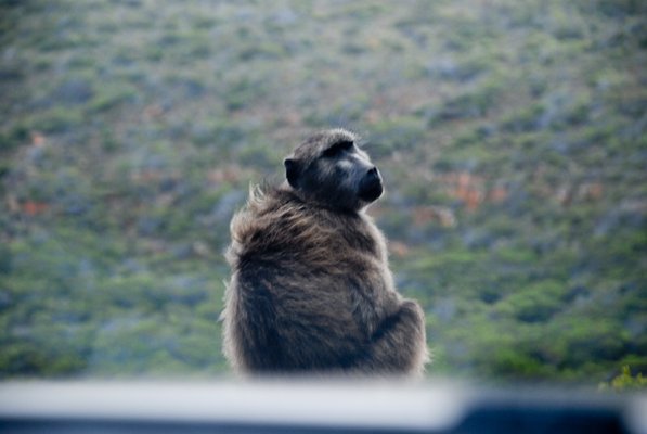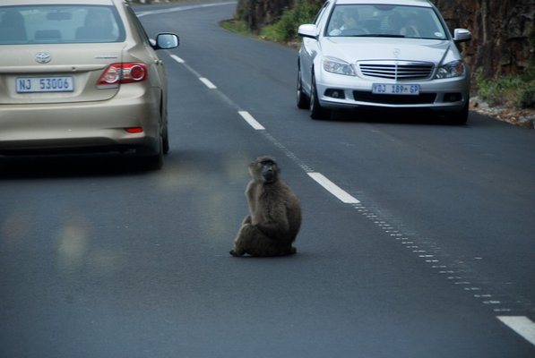 Az első páviánnál még rettenetesen örültünk. Régóta nézegettük a páviánveszély táblákat, de sehol egy fia majmot nem láttunk. Az elsőt tehát kiadósan lefotóztuk, ahogy rezignált nemtörődöttséggel, az útnak háttal üldögél egy kerékvetőkövön. Fogalmunk sem volt, hogy közvetlenül a kanyar után az ivarérés lázában a felezővonalon maszturbáló siheder páviánokat fotózhatunk, míg meg nem unjuk. Szerencsére jó a fék, meg gyorsan jár a villanyablak – Dél-Afrikában azért figyelmeztetnek táblákon az amúgy ismert tényre, hogy a páviánok vadállatok, mert bár tagadhatatlanul aranyosak, ugyanúgy tudják, hogy néz ki egy uzsonnáskosár, mint Maci Laci és Bubu. És akkor megszerzik. Elsősorban a Table Mountain parkolóiban kommandóznak, és a rajtaütés akár harapással is járhat. Meg mit tudom én, elviszik a csecsemőt, aztán felnevelik Tarzannak, mert imádják a míves jódlit.