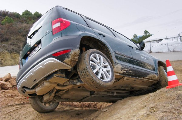 A tesztjárművek egyetlen extrája a téli gumi volt, ami szintén jelzi, mitől függ a vonóerő-átvitel. (Meg a board computert is letiltották, ne nézegessük a fogyasztást.) A Yeti alját persze itt-ott odavertük, de nem lett semmi baja. Tényleg csak a gázt kellett adni neki. Lefelé még azt sem. Ha ilyenkor az ember ráfékezett, a HDC visszavett a tempóból, gázadással meg gyorsítani lehetett a lejtmeneti tempomatot. Vicces, nem? Az ember lóg az övön, és csak kormányoz…