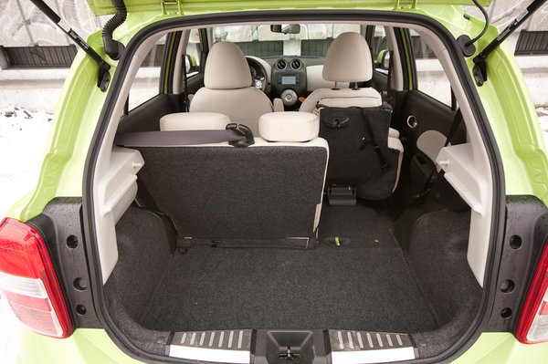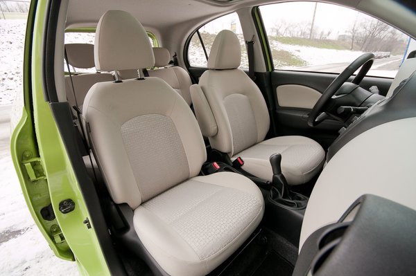 Akármennyire is fanyalgok, el kell ismernem: ez a Micra egészen jó méretű kisautó. Nem terjengősen hosszú, mint az ma divat, a hátsó ülésén mégis van annyi hely, mint mondjuk egy Citroën C3-ban vagy egy új Swiftben. Nem a legtágasabb, a Polo, a Corsa és a Fabia veri, mégsem teljesen dísz a hátsó ülés. Továbbá 265 literes a csomagtartója, ami elfogadható méret, a bővíthetősége pedig páratlanul jó: a hátsó ülés kempingszékszerűen hajtható előre. Ha összesítem, meg merem kockáztatni, hogy a Micra praktikumból többet ad, mint egy új Swift. Igaz, az élmenőknél meg kevesebbet – amolyan közepes, mint mindenben. Az ülései kényelmében is, rövid utakon elviselhető, de húsz kilométernél messzebb menve kiderül, hogy túl puhák és rövidek az ülőfelületei.