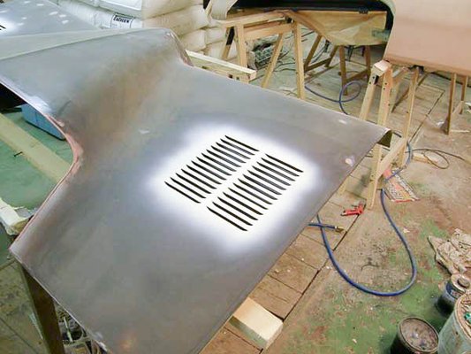 Spaklival, hőlégfúvóval, drótkoronggal a fémig csiszolta a lemezeket. A homokfúvás nem volt opció, hiszen a karosszéria és az alváz teljes szétválasztása szóba sem jöhetett. Így is komoly taktikázásra volt szükség, hogy legalább részlegesen el lehessen emelni a testet a váztól, hogy a csatlakozási pontok környékét le tudja ápolni. Amikor elért a fémig, hajózási epoxival kezdte a rétegrendet – ez sokkal lassabban, 24 óra alatt szárad, viszont tovább formázható, sokkal tapadékonyabb, mint az autós.