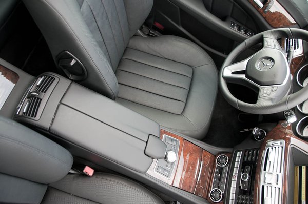 A belső tér különös módon nem igazán tükrözi a külső extravaganciáját, sőt, bizonyos szempontból inkább régimódi benyomást kelt. Az anyagok igényesek és kellemes tapintásúak, de ennél kevesebbet nem is várnánk egy felső-középkategóriás Mercedestől. Még a fémbetétek elhelyezése is egész ízlésesnek mondható, viszont elég nagy felület kapott valamilyen fényes, famintás burkolat. Mindig bajban vagyok, hogy nevezzem, mivel egyszerűen képtelenség megállapítani, hogy nagyon vastagon lakkozott fabetétről vagy famintás műanyagról van-e szó. Nem mintha fontos lenne, hisz az érzés, amit kelt, ugyanaz: ódivatú nappalik politúros bútorai teremtenek hasonló hangulatot, ami egy ilyen agresszív külsejű modellhez nemigen illik. Még szerencse, hogy a sötét szín miatt nem túl tolakodó.