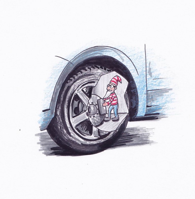 A négy tárcsaféknél négy törpe ül (Forgó, Morgó, Hapci és Kuka), ők szorítják a pofákat a tárcsákra, ha a gazda a fékre lép. Van egy brigádvezetőjük is, Vidor, aki egy kis képernyő előtt gubbaszt a motorházban, onnan adja az utasításokat, hogy ki mennyire fékezzen. Az ő állását (ülését) nagyon irigylik a többiek, jó meleg van a motorházban, a munka se bonyolult, csak a nagy zaj ne lenne.