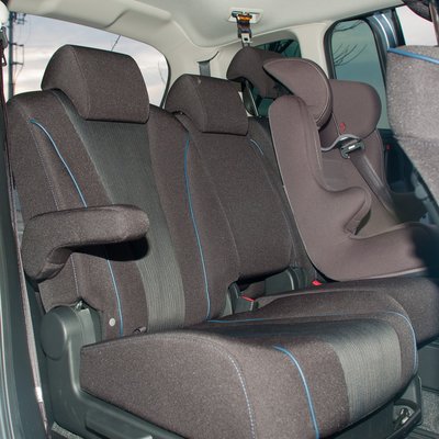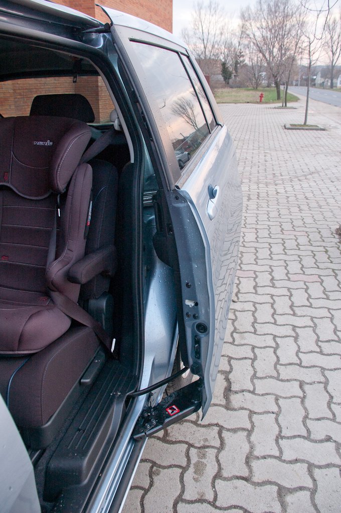 Az utasülés légzsákját ebben a konkrét autóban nem lehet kikapcsolni, pedig a könyv két helyet is említ, hogy a kormánytól balra melyik pulton kellene keresni a kulcsnyílást, de én nem találtam meg se itt, se másutt. Végül így került hátra a két gyerek, és értelmet nyert az osztott középső üléssor, mert nem kell szerencsétlenkedni a biztonsági övvel, az egyik gyereket hátratolom, hogy ne rugdalja a széket, a másikat meg simán be tudom tőle csatolni, akár ugyanazon oldalról.