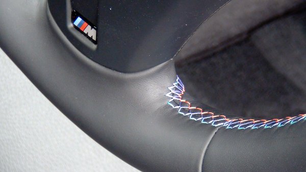 A beltér szűkösebb, mint a 3-asé, de azért elfértem, főleg miután rájöttem, hogy a háttámla szorításán egy gombnyomással enyhíthetek. Nem tudom, csak a Valencia-narancs 1M-ek belsejét varrogatják-e narancs cérnával, de nem néz ki rosszul. A műszerfal árnyékolója az egyetlen, ami kicsit furcsa: attól, hogy ilyen kerek, és szőrös alcantara, meg ott van alatta a műszerek két nagy köre, kicsit olyan, mintha a kormány mögül egy csodálkozó Csubakka bámulna a képünkbe. Vidámságot kedvelő BMW-sek tépőzárazhatnak rá két nyuszifület.