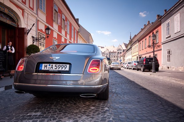 Oldalról a Mulsanne is mutatja a klasszikus brit luxusautó-sziluettet: olyan, mint egy jacht, amin épp rácsavarták a gázt, kicsit kiemelkedik az orra és besüllyed a tatja. A formai érdekességek nagyjából a hátsó ajtó táján kezdődnek. Itt már, hogy nem nyomaszt minket a szörnyű tekintetével, tudjuk értékelni a finoman faragott formákat, a minimális illesztési hézagokat, a hátsó kerekek feletti, a maga elefántos módján dinamikus szélesítést és az elegáns lámpákat. A hátsó szélvédő a C oszlopokkal és a csomagtartó élével együtt érdekesen be van homorítva, a kipufogók igen lapos ellipszisek; a Mulsanne legszebb nézete ez, valahonnan srégen hátulról.