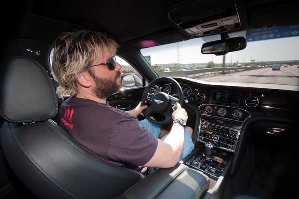 Mulsanne-unkhoz jár egy autótelefon is, ami jó szolgálatot tehet, ha otthon felejtettük a másfél milliós Vertu-t: ezt is hanyagul kidobhatjuk az asztalra. A multimédia hátulról is irányítható, miközben szorgos gépkezek gyúrják a hátunkat, ugyanis valamennyi ülésben van masszázsfunkció. Két hibát fedeztem fel a beltérben. Ahhoz képest, hogy a Mulsanne-ba saját lábúlag hajtottam bele a 800. kilométerét, a bal hátsó üléshez tartozó intarziás faasztalkát már nem lehet kihajtani, mert a konzoljából kiszakadt egy csavar. Továbbá a jobb hátsó oldalablakhoz tartozó árnyékoló egyik része rossz helyre tekeri magát. Van még egy apróság, ami nem biztos, hogy hiba, egy kis csalódás: vékony a szőnyeg, én legalábbis sokkal-sokkal nagyobb süppedést vártam volna. A tesztelést a jobb hátsó ülésen kezdtem: a helykínálat megfelelő – kevesebb a lábtér, mint egy hosszított 7-es BMW-ben, de igazából csak a felesleges tér hiányzik. Hú, de hihetetlenül finoman is siklik ez a macskakövön! Leszámítva a hányingert, amit egy bő félgázos gyorsítás okozott. Aztán előreültem, és elálmélkodtam, mennyire durván érezhető, hogy a hátsó ülésre lőtték be a rugózást. A Rolls-Royce Phantomban nem volt ekkora a kontraszt, az nagyjából ugyanúgy rugózott elöl-hátul.