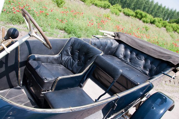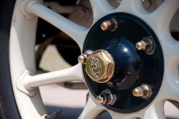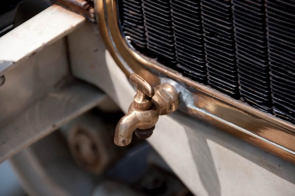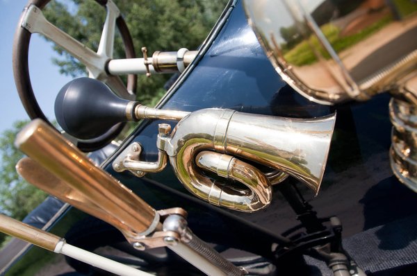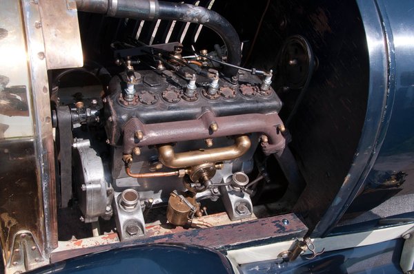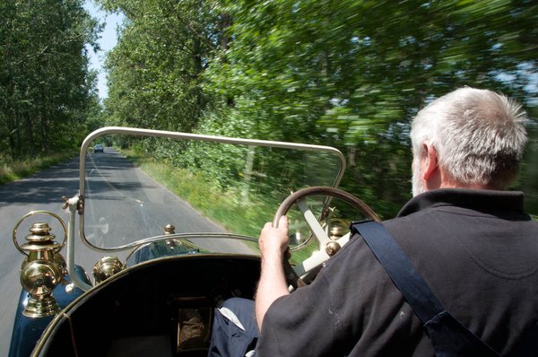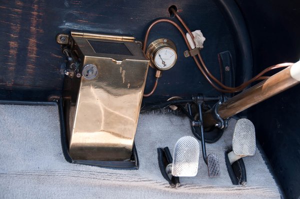 De egyelőre csak azért ülünk be, hogy indításhoz feljebb tekerjük a kézigáz karját a volánon, majd nyomás alá helyezzük a benzint a tankban, amit a kormányoszlopra szerelt, biciklipumpának látszó eszköz serény igénybevételével érünk el. Szerencsére nincs hideg, mert akkor a hengerfejen levő kis réz pohárkákba benzint kellene csepegtetni, hogy megfelelő legyen a dúsítás. Ilyenkor nyáron azonban elég megúsztatni a karburátort – akinek volt régebbi motorja, tudja, hogyan kell: az ember lenyom egy gombot az úszóházon, és amikor kifolyik a benzin a szellőzőfuraton –, és lehet krenkölni. Itt nem nyomni, hanem húzni kell a gombot, de az elv ugyanaz. Kurblizhatunk. Önindító nincs, ahogy akkumulátor sem, de még a lámpa is acetilén gázzal, a kürt pedig levegővel működik. Ebben az autóban egyáltalán nincs elektromos rendszer, a szikrát önálló villamos egységként a motor mellé csavarozott Bosch magdinó szolgáltatja.
