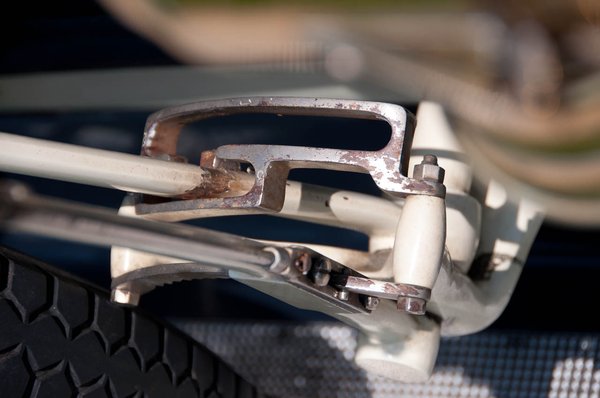 Rettegtem a féktől, mert lassítani nemhogy a tízes, de sokszor még az ötvenes-hatvanas évek autói sem tudtak igazán. Az akkori autóipari gyakorlatot követve a Puppchenben a pedállal működtethető üzemi fék a kardánra hat, a hátsó dobok a kézifékhez tartoznak. Érdekes, ez fog. Nem mondanám, hogy száraz aszfalton egy óvatlan mozdulat elég ahhoz, hogy blokkoljuk a hátsó kerekeket (az elsőkön egyáltalán nincs fék), de a Puppchen még az 55 km/h-s végsebessége közeléből is határozottan lelassítható. Naja, a menetkész alváz csak 575 kilós, karosszériával együtt eléri akár a 650-et is…