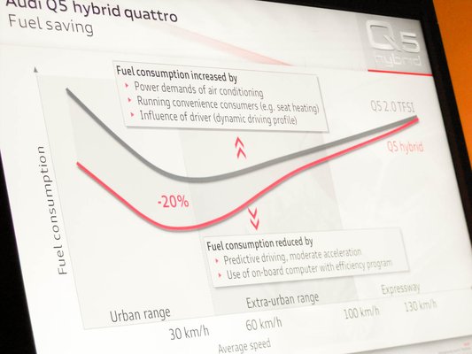 A Q5 az Audi első hibrid autója. Ez a rendszer kerül majd az A6 és az A8 hibridbe is, és a műfaj hagyományai szerint ez is teljesen másképp működik, mint a Toyota/Lexus, vagy a Honda rendszere. Annyi biztos, hogy valódi hibrid, nem mikrohibrid, vagy adócsaló hibrid: van benzinmotorja, villanymotorja, a fékezési energiát visszatölti és tárolja, és mivel Audi az istenadta, természetesen több dologban veri a mezőnyt. Például lítium-ionos az akkucsomag, és 100 km/h-ig gyorsulhat csak a villanymotorral. Ahogy a vezető lába lekerül a gázpedálról, a villanymotor generátorként kezd viselkedni, és visszatermel. Ha meg leálltunk a pirosnál, és elindulnánk, önindító. Vagy papucs orrán pamutbojt – akit nem érdekelnek a technikai részletek, megnyugodhat, ez tényleg valódi, vagy ahogy az egyszeri értékesítő mondja, full hibrid, mely a sima TFSI-hez képest mindössze 145 kilóval lett nehezebb.