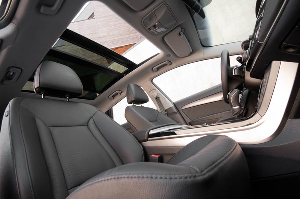 Ezek után nem ért váratlanul, hogy elférek. Nem kicsit, nagyon. Hátul meg pláne. Természetesen csupa csúcskivitelű, bőrös i40 volt a bemutatón, nyitható üvegtetővel, ehhez vaskos árnyékoló roló is jár: a fejtér így is fejedelmi, hátul is, pedig a tető valóban lejtős.