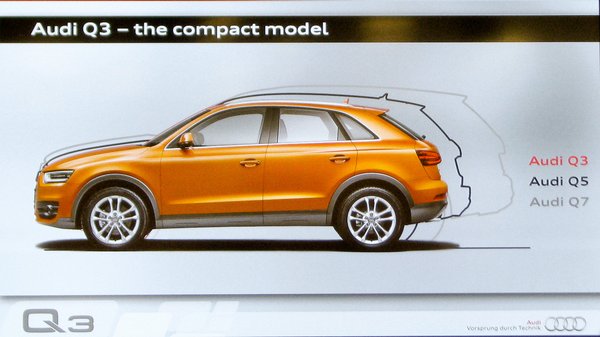 A kivetítőn ott áll feketén-fehéren, aki nem vak, láthatja: a Q3 kisebb, mint a Q5. Lám, köré rajzolták annak sziluettjét, és szinte elvész benne, lötyög a vékony fekete keretben. Majdnem huszonöt centivel rövidebb, öttel keskenyebb, hattal alacsonyabb. Csakhogy ez nem lehet igaz. Mert a Q3 nem kicsi. A Q5 az volt: törpe a Q7 mellett. Szűkösnek éreztem, 2,8 méteres tengelytáv ide, 540 literes csomagtér oda. Olyan volt, mint egy kisfiú, aki nagyon szeretett volna Q7 lenni, de elhagyta a kondibérletét, és nem volt mersze újat kérni. A Q3 azonban semmivel sem játékosabb, szerényebb vagy barátságosabb a Q5-nél. Pontosan replikált klón, öt százalékkal csökkentett méretű kiadásban. Ruházati cikk, amit eddig csak L-ben gyártottak, mostantól kapható M-ben is.