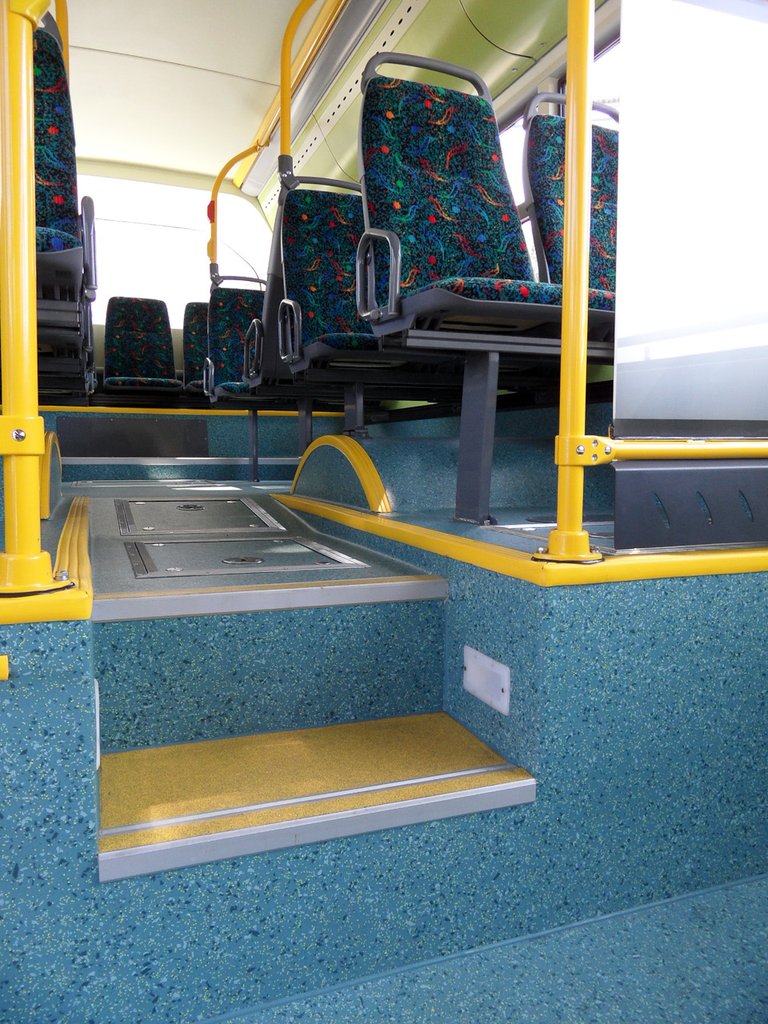 A hátsó, magasabb részbe két lépcsővel lehet feljutni, de a harmadik ajtó megszűntével itt nincs jövés-menés. A fellépőmagasság négy centivel nagyobb, mint a városi Siriusnál: 38 centi. Poggyásztartók is kerültek az utastérbe, kapaszkodóból viszont lényegesen kevesebb van, mint a városi verzión.