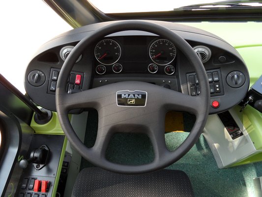 A vezetőfülke kialakításán is változtattak, bár csak apróságokat. A burkolatok tükröződésgátlósak, és kialakítottak pár tárolóhelyet a sofőr holmijainak, még egy külön zárható rekesz is lett a plafonon. Az alap elrendezés változatlan, azaz a gyári MAN-részegységeket használták, nem barkácsoltak mást az olcsóság kedvéért. Ahogy egyik 2003-as cikkünkben láttam, jobb is. Így rendezett, jól átlátható és gusztusos munkahelyet sikerült kialakítani a sofőrnek.